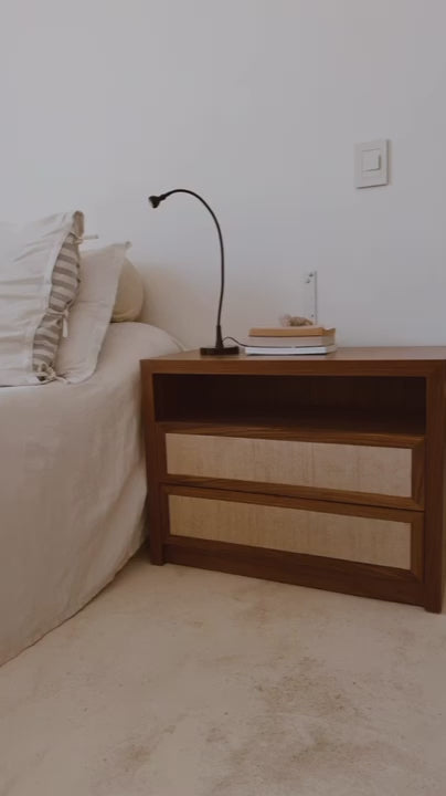 Material: Realizada en madera enchapada con frente de cajones en rafiaMadera: Madera de estación o Petiribi